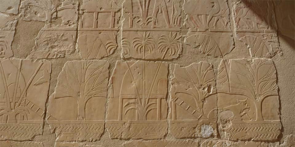 Sur les reliefs du Portique consacré à l’expédition, on découvre des vues du Pays de Pount. Sur le bord de l’eau, on distingue des huttes montées sur pilotis auxquelles on accède par des échelles. Le paysage se compose de palmiers dattiers, de cocotiers, de sycomores et d’arbres à encens. À l’extrémité droite du relief, un bovidé se repose à l’ombre de la feuillée. Entre les arbres, un oiseau à longue queue s’envole.