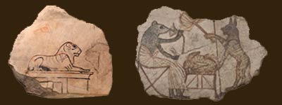 Tantôt faisant fonction de cahier de brouillon, tantôt utilisé comme carnet de croquis, l’ostracon se présente le plus souvent sous la forme d’un éclat de pierre ou d’un tesson de poterie. Le « maître dessinateur » les utilise pour effectuer des études en vue d’un projet ou avant une mise au net à plus grande échelle.